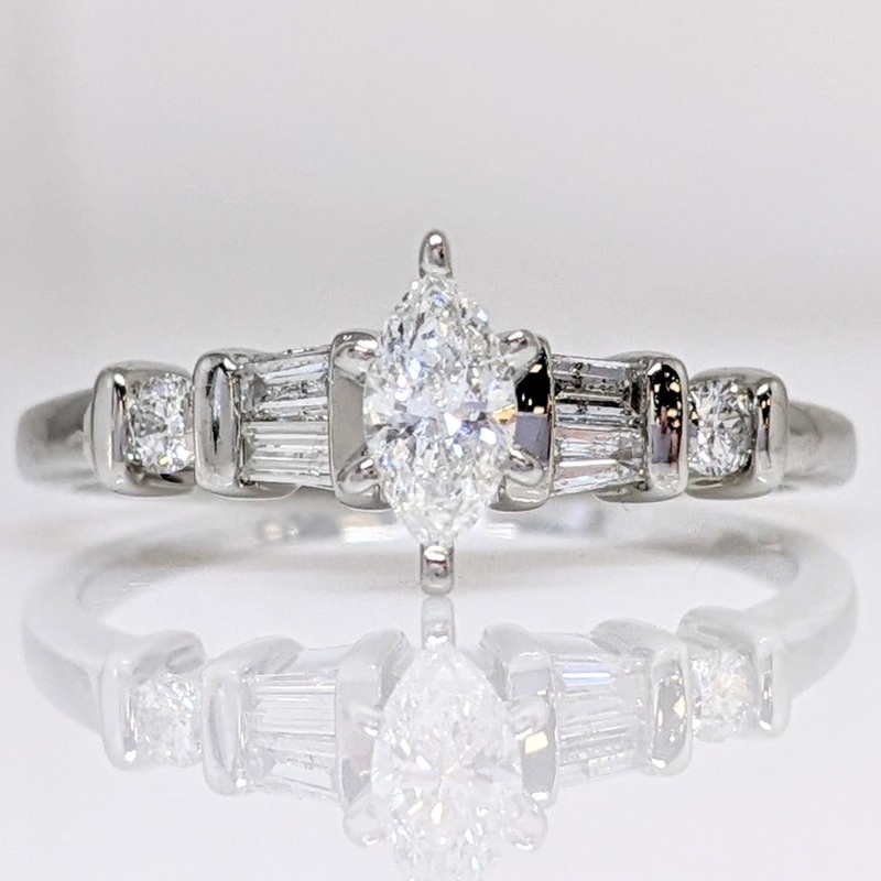 This stunning estate ring is crafted from Platinum and features a diamond of .41 carat total weight in I1 clarity and F color, in a marquise cut, complemented with four baguette cuts and two round cuts. 4.0 grams.BIN 215SIZE 7 1/4
