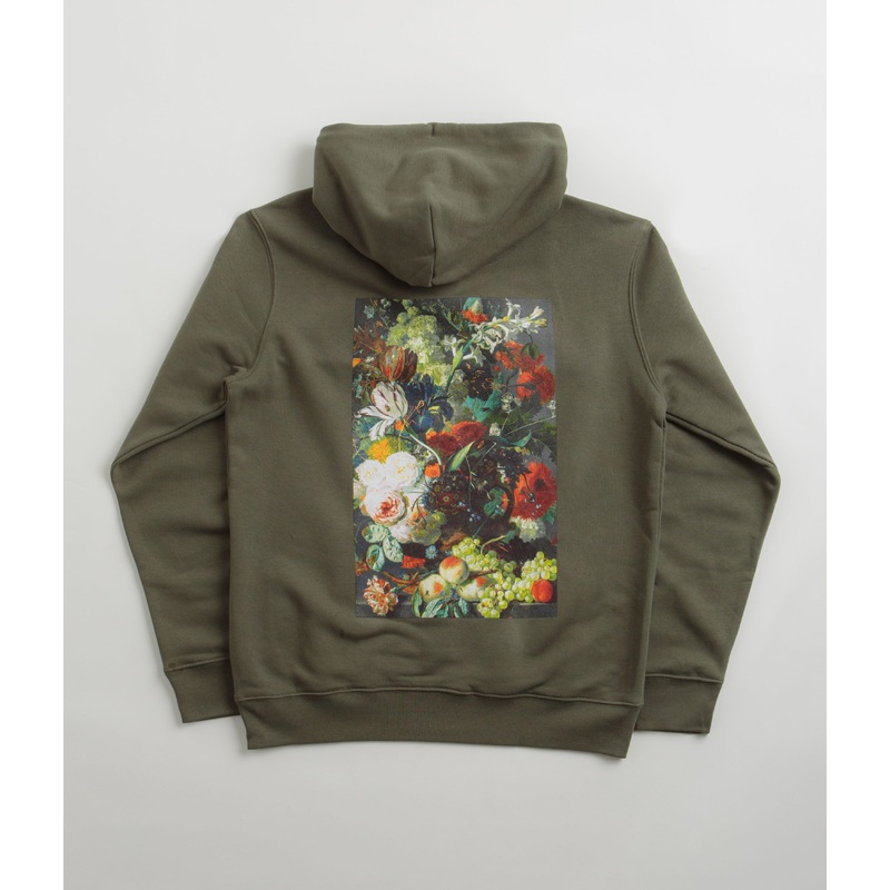 Poetic Collective Flower Hoodie in Khaki. Made from an organic cotton and recycled polyester blend, this relaxed fitting Poetic Collective hoodie arrives as part of the brands latest release. Featuring a drawstring hood, dropped shoulders, ribbed cuffs and a woven elastic hem, this khaki green Poetic Collective hoodie is finished with a kangaroo front pocket, chest embroidery and printed rear graphics.