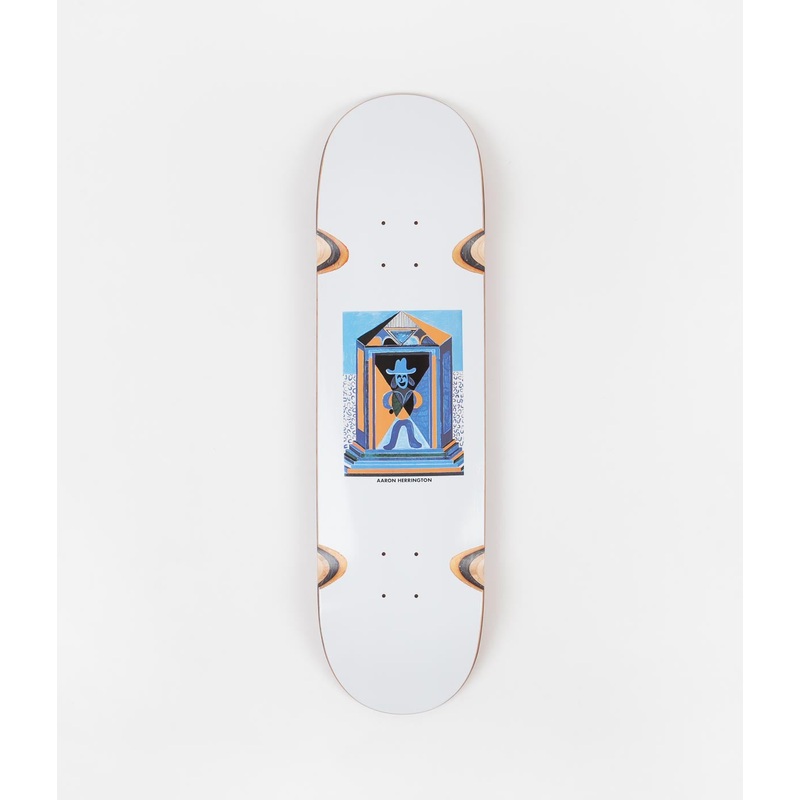 Polar Aaron Herrington Mausoleum Wheel Well Deck in White. A new Polar Skate Co. deck featuring artwork by Los Angeles based artist Tynan Kerr, this Aaron Herrington pro model is made from high quality 7-ply maple. Painted in tones of blue, yellow and black, the artwork has been positioned within the centre of either truck hole set and shows an abstract character wearing a hat stood in a small sheltered building with a triangular roof and small sets in front of the entrance. For further interest the background includes a split blue line with a two tone curved print below and to signify the deck Aaron Herrington lettering can be seen underneath. On either side of both truck hole sets carved wheel well shapes allow you to get lower on your board for greater control and stability.