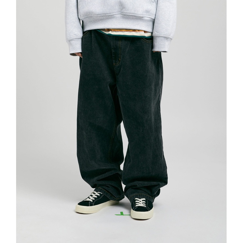 Polar Big Boy Jeans in Washed Black. Made from 100% cotton denim with a washed fabric finish, these baggy fitting Polar jeans are styled with a tapered leg and a classic belt loop waist. Featuring a single button secured YKK zipper fly and tonal stitched seams, these black Polar Big Boy jeans are finished with two front pockets, an embroidered character coin stash, two rear patch pockets and with a classic Big Boy woven belt patch.