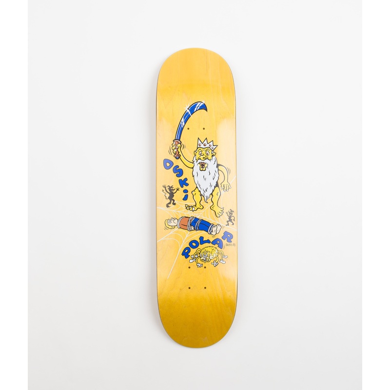 Polar Oskar Rozenberg Spider King Deck in 8.5″. Arriving as part of the brands SP22 hardware release and featuring exclusive artwork from Jacob Ovgren for team rider Oskar Rozenberg, this new season Polar deck is made from premium 7-ply maple. With a width of 8.5 and an assorted wood veneer topside, this Polar skate deck is finished with a yellow stained underside that features an illustrative sword-wielding spider king design with two devils, a spider and cartoonish Oski Polar branding.