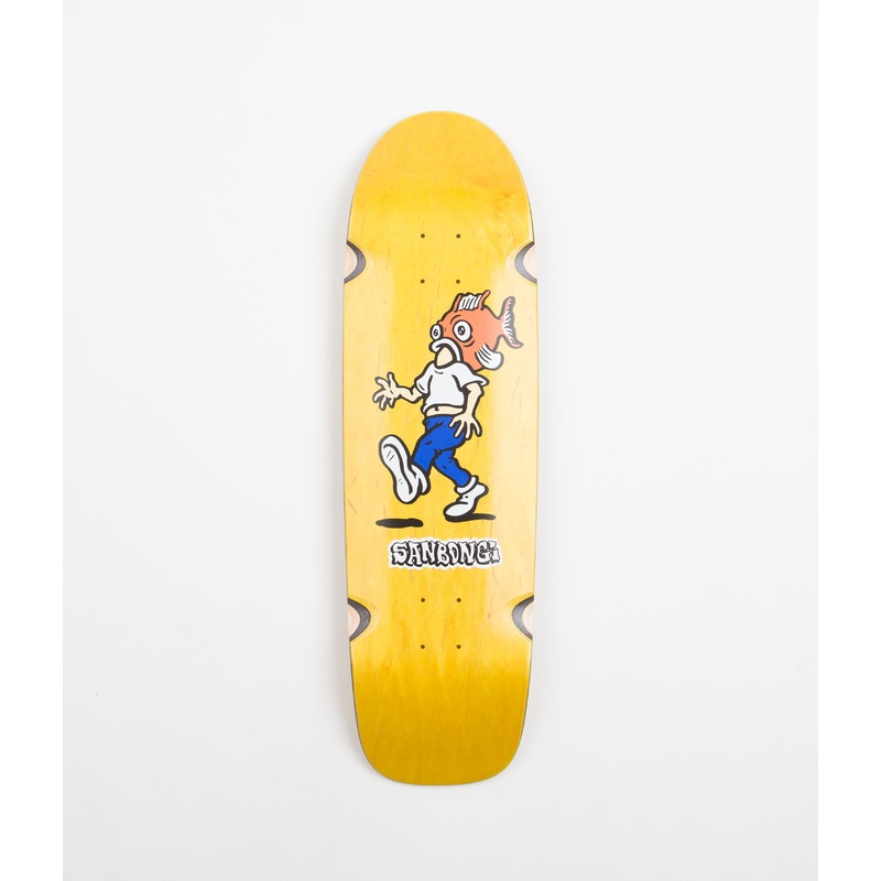 Polar Shin Sanbongi Fish Head Surf Shape Wheel Well Deck in 9″. Made from premium 7-ply maple and featuring exclusive artwork by Jacob Ovgren, this Polar deck arrives as the latest signature release for team rider Shin Sanbongi. Styled with a width of 9 with carved wheel wells and a vintage shape, this assorted wood veneer deck is finished with a yellow stained underside, a printed fish head character and with graffiti-style Sanbongi branding printed beneath.