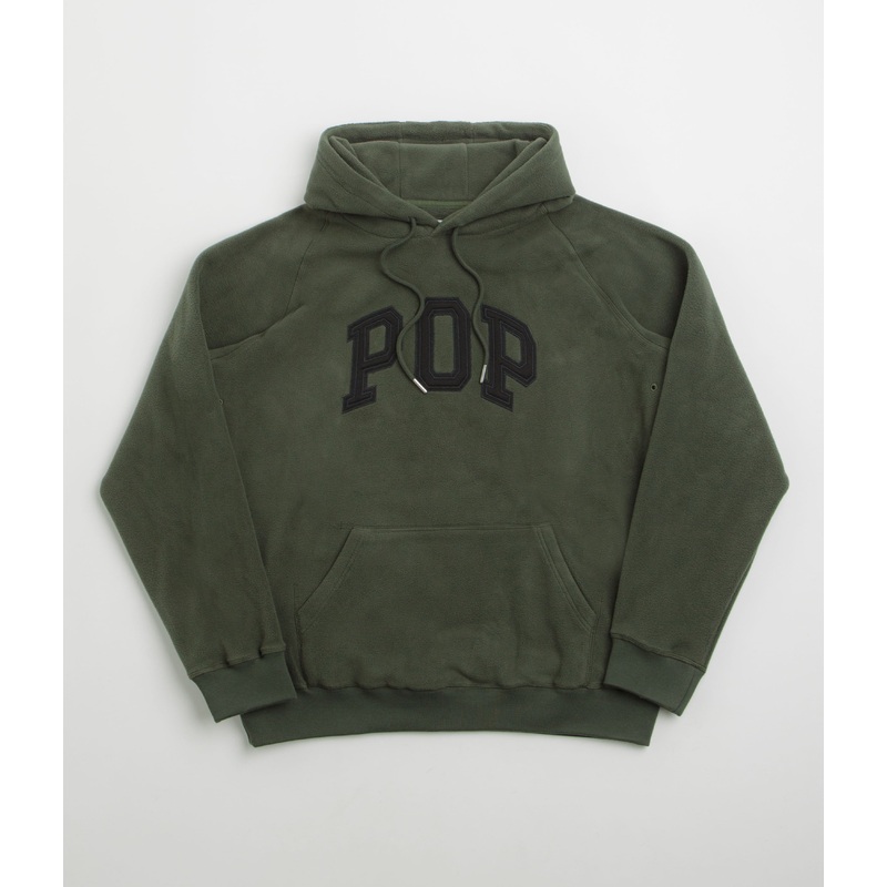 DescriptionPop Trading Company Arch HoodiePop Trading Company Arch Hoodie in Duffel Green. Made from 100% polyester polar fleece, this Pop Trading Company hoodie is designed with a triple panel hood with raglan sleeves. Featuring applique branding, embroid