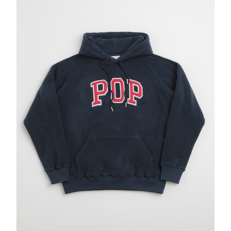 Pop Trading Company Arch Hoodie in Navy and Red. Regular fitting and made from 100% polyester Polar fleece, this Pop Trading Company hoodie is designed with raglan sleeves and applique embroidered branding. Featuring ribbed cuffs and a kangaroo front pocket, this navy Pop Trading Company hoodie is finished with a woven elastic hem and embroidered logos.