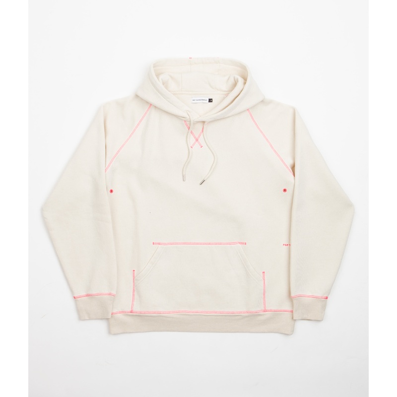 Pop Trading Company x Lex Pott Hoodie in Natural White. Arriving as part of the brands latest release for SS22 and designed in partnership with product designer Lex Pott, this long sleeve Pop Trading Company hoodie is crafted from 100% natural cotton with a resilient 340gsm composure for increased insulatory comfort. Undyed and untreated, this off white hoodie features elasticated cuffs, a triple panel hood, a V-insert exposed stitch neckline and neon print stitching throughout for an added layer of textured depth. Tonal embroidered underarm ventilation eyelets are complemented by a dual entry kangaroo pocket above the waist, whilst the raglan style sleeves deliver a streamlined sense of appeal. Signed off with embroidered Pop Trading Company left side detailing and with printed POP branding displayed between the shoulders on the reverse.