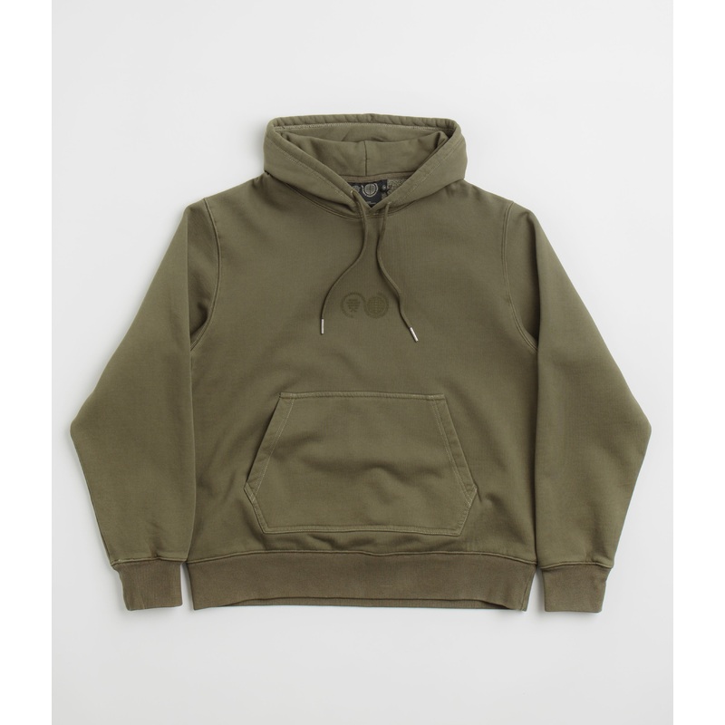 Purple Mountain Observatory Garment Dye Hoodie in Khaki. Garment dyed and regular fitting, this Purple Mountain Observatory is made from 100% cotton fleece with a brushback lining. Featuring a drawstring adjustable hood, ribbed cuffs and a rib knit hem, this khaki green Purple Mountain Observatory hoodie is finished with a kangaroo front pocket and with printed centre chest branding.