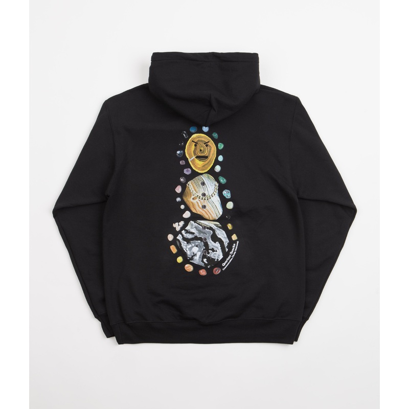Quartersnacks Gem Snackman Hoodie in Black. Crafted from a poly-cotton blend and tailored to a regular fitting, this black Quartersnacks hoodie is a long sleeve sweater styled with a split panel hood. Featuring a woven elastic hemline, cuffed sleeves and tonal drawcords across the neckline. Styled with a dual entry kangaroo pocket above the waist, this screen printed Quartersnacks hoodie is finished with Quartzer Snacks: Communication, Clarity, Wellbeing chest detailing with a large gemstone inspired Snackman character printed on the reverse.