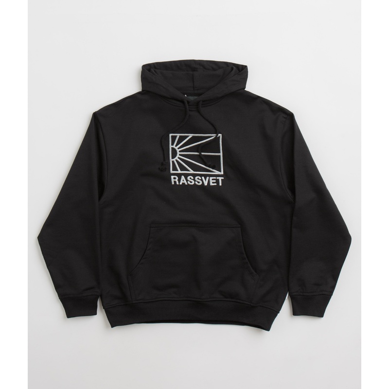 DescriptionRassvet Logo HoodieRassvet Logo Hoodie in Black and White. Made from 100% cotton, this block tone Rassvet hoodie is designed with an adjustable drawstring hood and dropped shoulders. Featuring ribbed cuffs, a kangaroo front pocket and with embro
