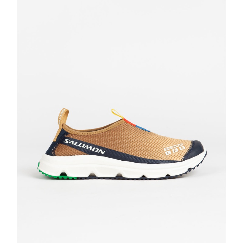 Salomon RX MOC 3.0 Shoes in Rubber, Taffy and Granada Sky. Designed to reduce all forms of physical stress on the foot, this Salomon RX MOC 3.0 is crafted with seamless 3D open mesh uppers with a lightweight EVA midsole and moulded EVA sockliner. A sportstyle silhouette with a slip-on construction, this brown Salomon RX MOC also features a leather footbed, a protective toe cap and with a grippy All Terrain Contagrip tread. Finished with woven pull tabs and with additional Salomon LAB branding displayed across each forefoot.