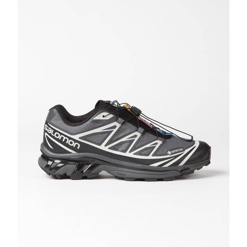 Salomon XT-6 GTX Shoes in Black, Ebony and Lunar Rock. Designed with a waterproof PFC-free Gore-Tex membrane and a closed mesh construction, the Salomon XT-6 GTX draws technical inspiration from one of the brands most popular profiles. Styled with a downhill chassis and contoured lug geometry, this black Salomon XT-6 GTX also features abrasion resistant TPU uppers, a Mud Contagrip tread, SensiFit cradling and moulded OrthoLite sockliners. The Quicklace system provides a locked-in fit across the arch of the foot, whilst the sculpted tongue supplies further protective coverage. Finished with woven Salomon tongue labels, printed insoles and with S-LAB XT6 Gore-Tex branding displayed across each heel.