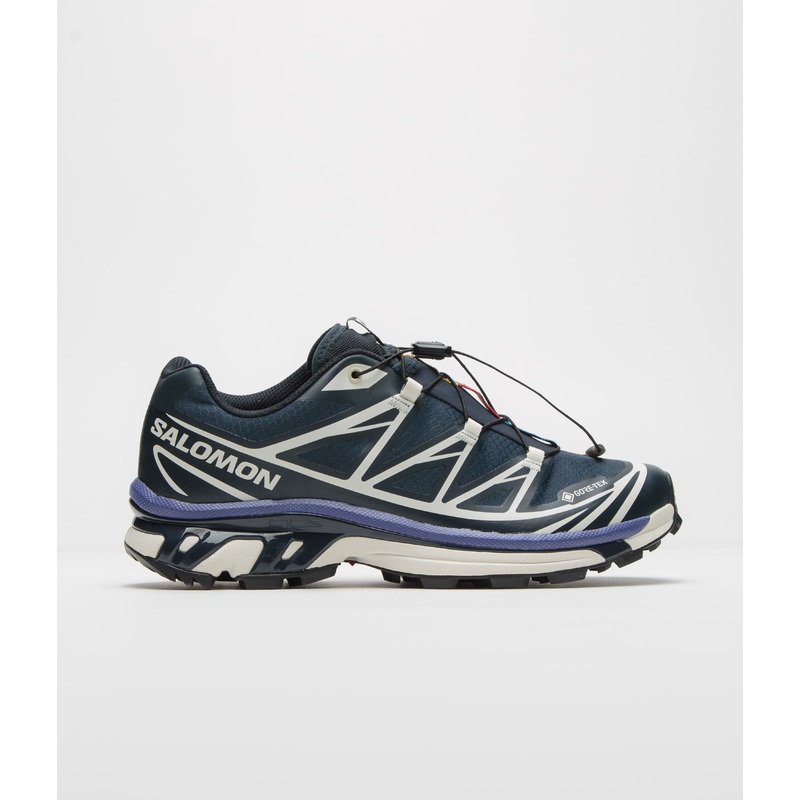 Salomon XT-6 GTX Shoes in Carbon, Vanilla Ice and Liberty. Inspired by a legacy on the trail, this Salomon XT-6 GTX is designed with a synthetic and textile upper. Featuring a Gore-Tex ePE membrane, an anti-debris mesh construction and an Agile Chassis System, this navy Salomon XT-6 GTX also features EVA cushioning, an OrthoLite insole and a Contagrip tread. Finished with a textile lining, a Quicklace fastening and printed Salomon branding.