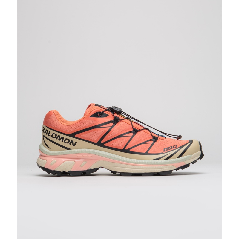 Salomon XT-6 Shoes in Living Coral, Black and Cement. Designed with trail innovation in mind, this Salomon XT-6 is styled with mixed synthetic and textile uppers with EVA cushioning and a pioneering downhill chassis. Featuring an OrthoLite insole, TPU overlays and a multi-tread Contagrip rubber outsole, this coral pink Salomon XT-6 is finished with a Quicklace fastening, woven tongue labels and with printed Salomon S-LAB lateral quarter branding.