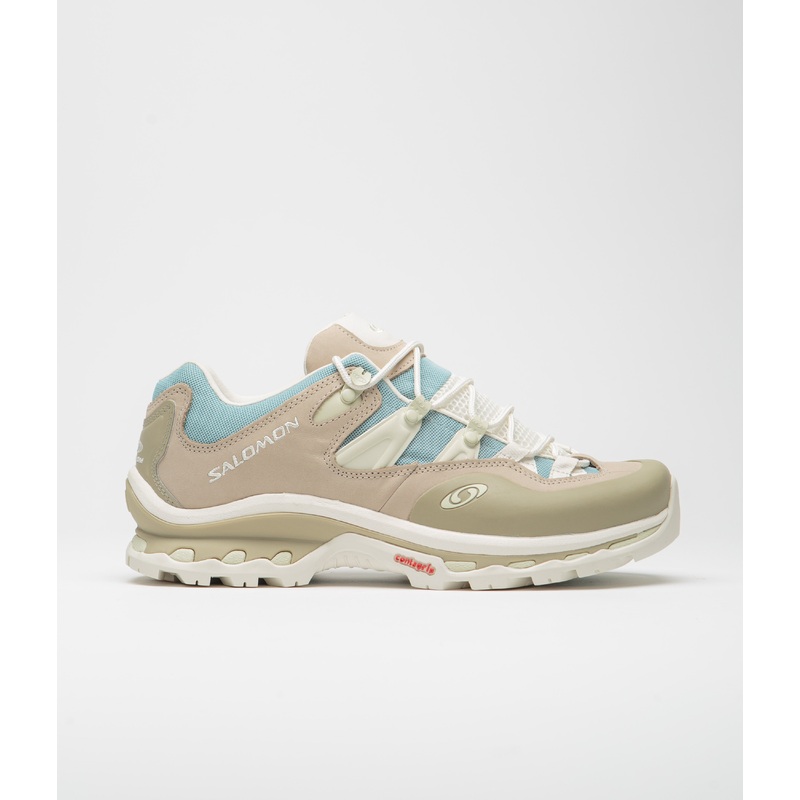 Salomon XT-Quest 2 Shoes in Winter Pear, Sterling Blue and Slate Green. A hybrid style inspired by archived favourites, this Salomon XT-Quest 2 is designed with mixed leather and mesh uppers with a hiking style lacing system and a 4D Advanced Chassis. Featuring breathable underlays, cushioned EVA midsoles and with SensiFit cradling, this beige and blue Salomon XT-Quest 2 also features a secure grip lug pattern with a Contagrip outsole. Finished with contrast eyelets stays, a padded collar, Salomon heel detailing and with custom printed insoles.