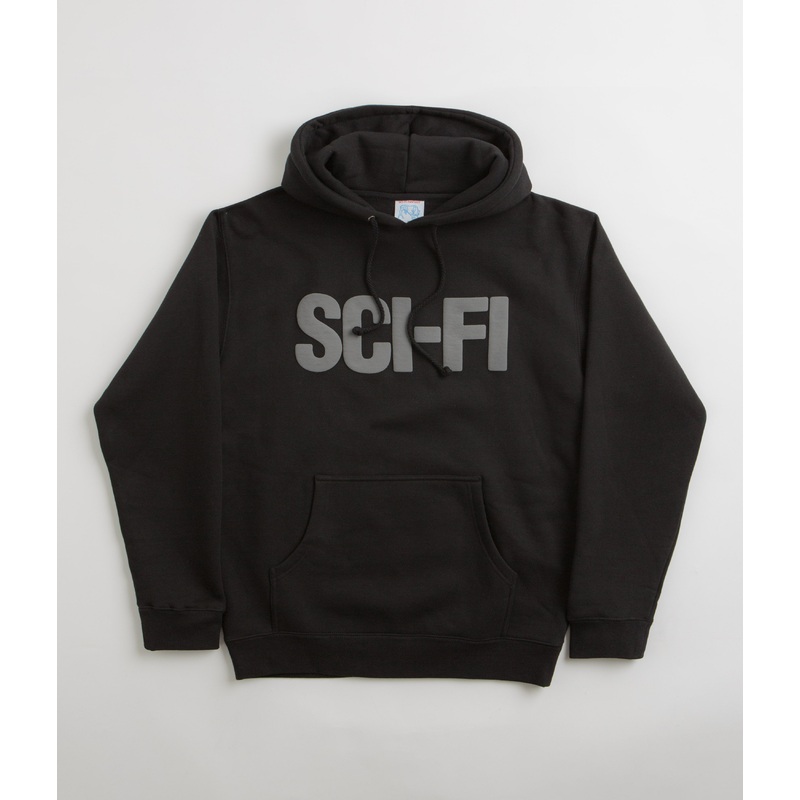 Sci-Fi Fantasy Big Logo Hoodie in Black. Regular fitting and made from a heavyweight cotton-polyester blend, this Sci-Fi Fantasy hoodie is designed with a drawstring hood and ribbed cuffs. Finished in a shade of black with a ribbed hem, a kangaroo front pocket and with a puff print Sci-Fi chest logo.