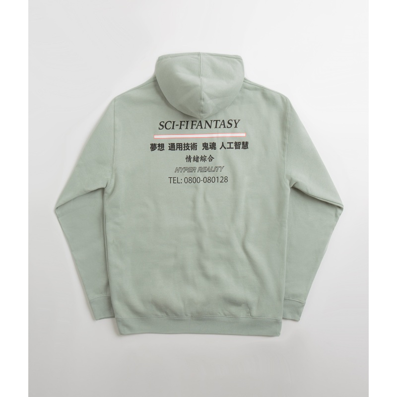 Sci-Fi Fantasy Industrial Hoodie in Sage. Made from a heavyweight cotton-polyester blend, this regular fitting Sci-Fi Fantasy hoodie arrives as part of the brands latest release. Featuring a drawstring hood, ribbed cuffs and a woven elastic hem, this sage green Sci-Fi Fantasy hoodie is finished with a kangaroo front pocket and printed graphics displayed across both the left chest and rear.
