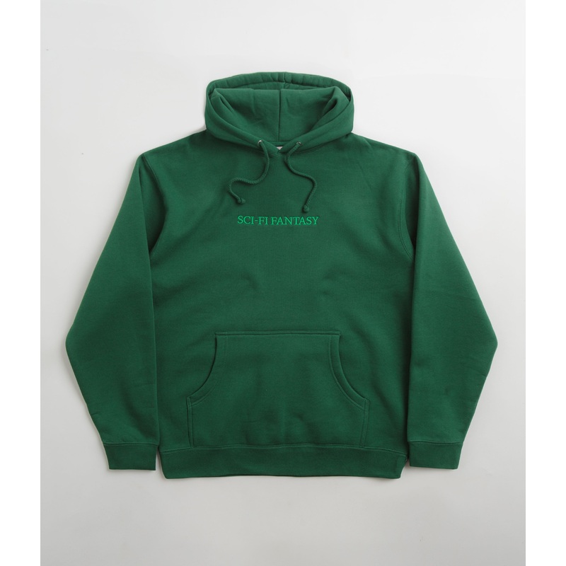 Sci-Fi Fantasy Logo Hoodie in Dark Green. Tailored to a regular fitting from a cotton-polyester blend, this heavyweight Sci-Fi Fantasy hoodie is designed with a drawstring hood and ribbed cuffs. Finished with a woven elastic hem and a kangaroo front pocket, this green Sci-Fi Fantasy hoodie also features embroidered chest branding.