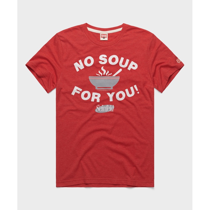 Theres strict, and then theres soup kitchen strict. Rep convoluted culinary rules and the great Senifeld with a super-soft tee for the adventures of Jerry, George, Elaine and Kramer as they just try to order a bowl of soup. No Soup For You!