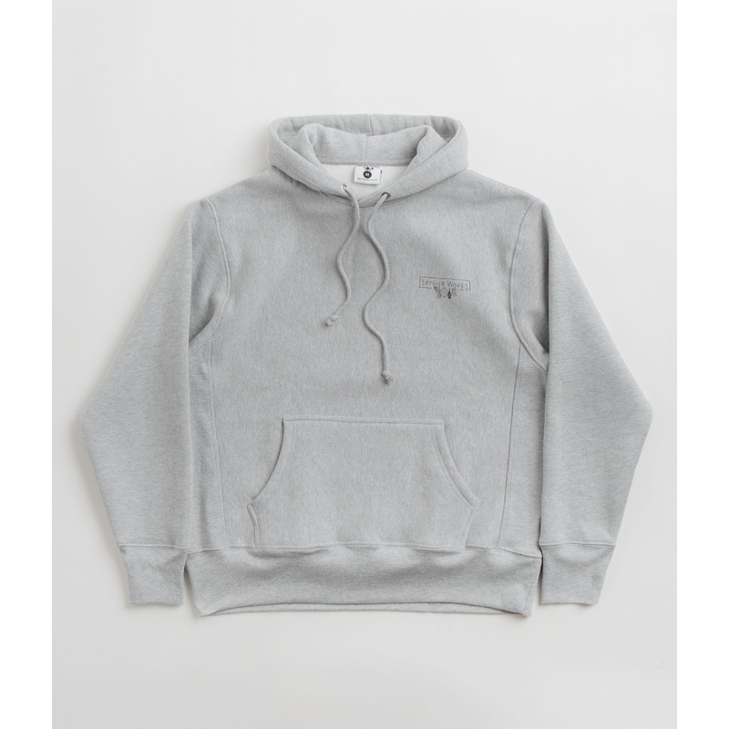 Service Works Scribble Logo Hoodie in Grey. Tailored to a regular fitting from a cotton-polyester blend, this Service Works hoodie is designed with a heavyweight construction and a drawstring adjustable hood. Featuring ribbed cuffs and a woven elastic hem, this grey Service Works hoodie is finished with a kangaroo front pocket and screen printed left chest branding.