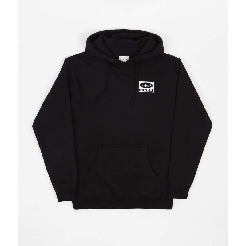 Skateboard Cafe 45 Hoodie in Black. A poly-cotton long sleeve layer inspired by heritage music culture and sportswear tradition, this new-season Skateboard Cafe hooded sweater is designed to provide exemplary insulative protection when paired with any on-the-go setting. Tailored to a non-invasive regular fitting with cuffed sleeves and an elasticated hemline, this comfortable hooded staple features an above-waist kangaroo storage pocket and colour-matched drawcord trims across its spacious deep-set hooded neckline. Embroidered trumpet-inspired Cafe branding is detailed across the left-chest, whilst the same monochrome design is repeated and enlarged across the reverse above clean-lined Live Studio Sessions: Vol. 2 print branding.