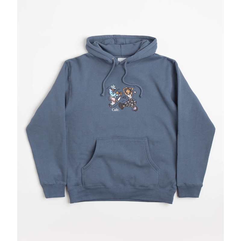 Skateboard Cafe Dancing Hoodie in Purple. Seen here in a colour block shade, this regular fitting Skateboard Cafe is made from a cotton-polyester blend. Featuring a drawstring hood, cuffed raglan sleeves and a woven elastic hem, thisgrey hoodie is finished with a classic kangaroo front pocket and printed Cafe artwork displayed across the centre chest.