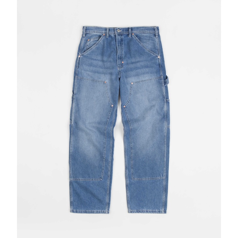 Stan Ray Denim Double Knee Pants in Vintage Stonewash. Tailored to a relaxed fitting with a straight leg cut, these heavyweight Stan Ray pants are styled with a stonewashed denim finish made from a cotton-elastane blend. Inspired by workwear staples, these blue Stan Ray pants feature a single button secured YKK zipper fly, double layered front leg panels and flat felled seams. Finished with two front pockets, a single coin stash, two rear pockets, utility pockets and a woven hammer loop with an embroidered flag label sewn across the rear.