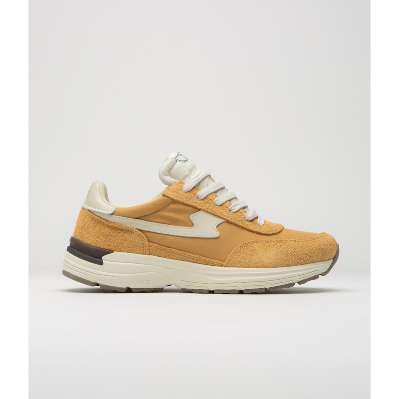 Stepney Workers Club Osier S-Strike Raw Suede Shoes in College Yellow. A take on a 70s runner, this Stepney Workers Club Osier S-Strike is designed with hairy suede uppers and tonal nylon panelling. Featuring a cushioned EVA midsole, a cleated rubber tread, a gum rubber outsole and a TPU heel clip, this college red Stepney Workers Club Osier S-Strike also features abrasion-proof laces and a raw edge padded tongue. Finished with woven tongue labels, printed insoles, leather side stripes and with additional S.W.C detailing.