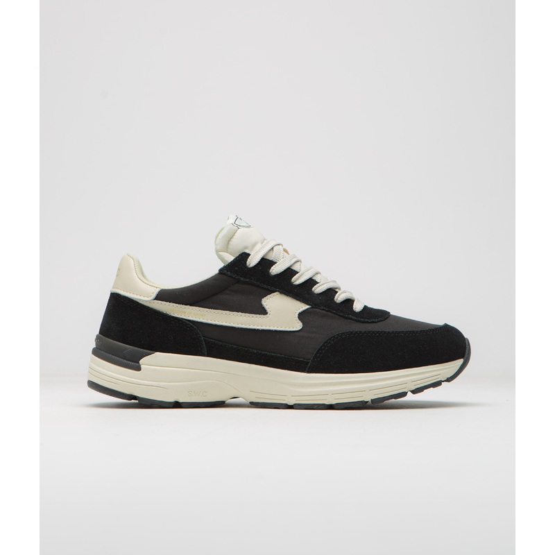 Stepney Workers Club Osier S-Strike Suede Shoes in Black. Inspired by 70s runners with a cleated rubber tread and suede uppers, this Stepney Workers Club Osier S-Strike is designed with tonal nylon panelling and a raw edge padded nylon tongue. Featuring an EVA cushioned midsole, a TPU heel clip and a rubber outsole, this black Stepney Workers Club Osier S-Strike is finished with white leather side stripes, printed insoles and with additional S.W.C heel detailing.