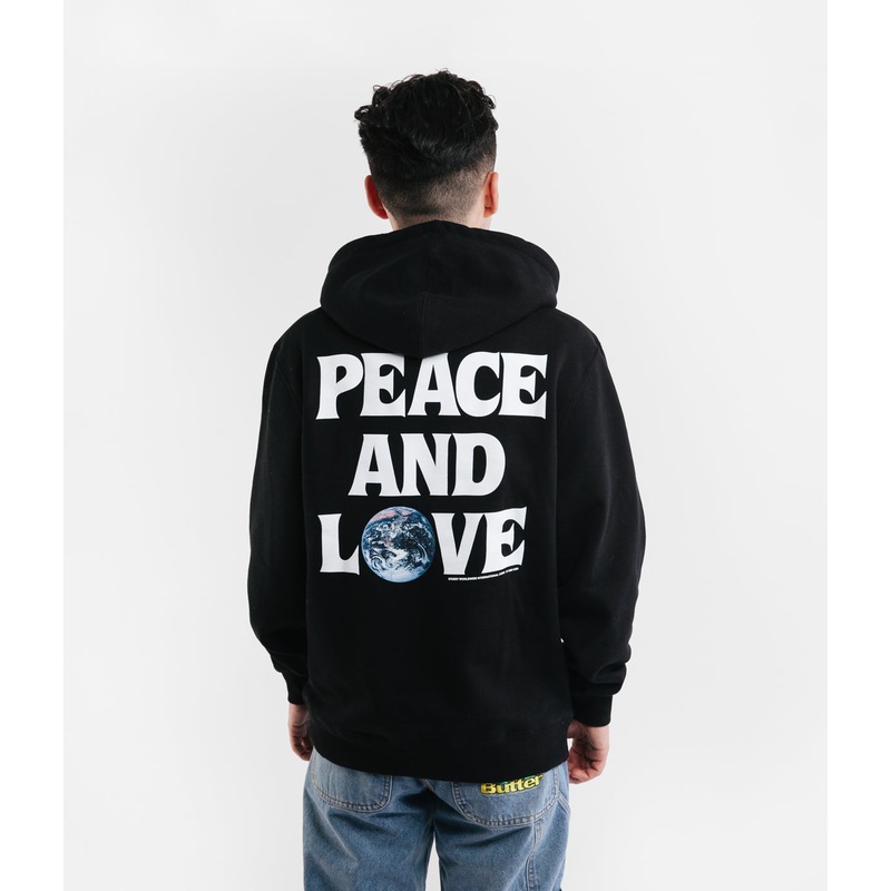 DescriptionStussy Peace & Love HoodieMade from a soft blend of cotton and polyester, this black Peace & Love Hoodie from Stussy features bold screen printed graphics on the front and reverse. Ideal for layering throughout the year, the attached hood offers