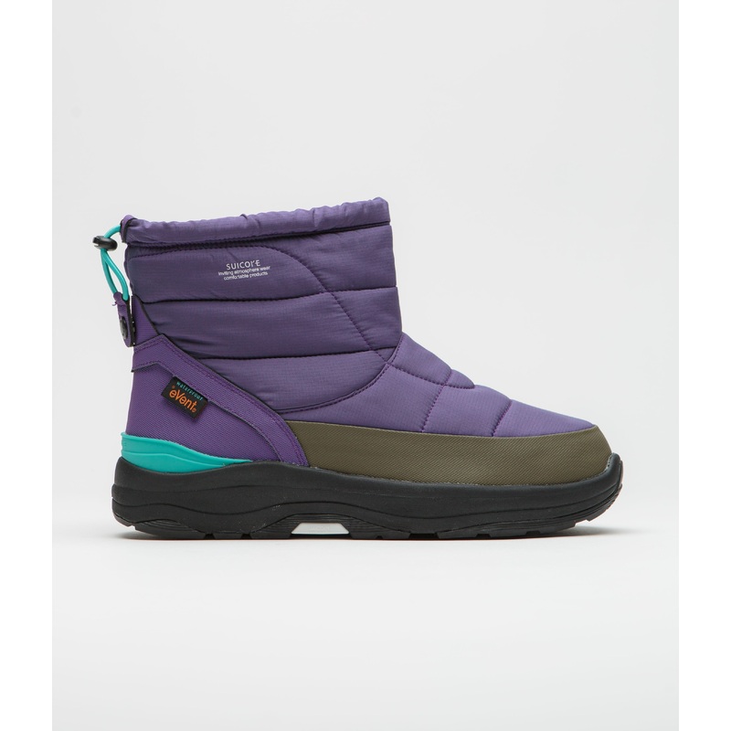 Suicoke Bower Modev Shoes in Purple and Black. Designed with a mid-height cut, this Suicoke Bower Modev is designed with synthetic fibre and artificial leather uppers with a waterproof eVent lining. Featuring a quilted construction and 3MTM ThinsulateTM insulation, these purple black Suicoke boots are finished with a toggle-cord cuff, branded cork Suicoke insoles and with original Running outsoles.