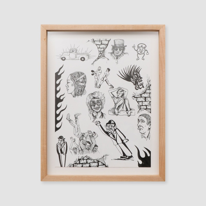 Mike Lottie Gigliottis artworks. Frames by Josh Pall.While Lotties practice has touched on painting, pottery, and watercolour, this exhibition returns to his roots, black ink pen on paper."Growing up, I was lucky to have parents who at one time owned a chi