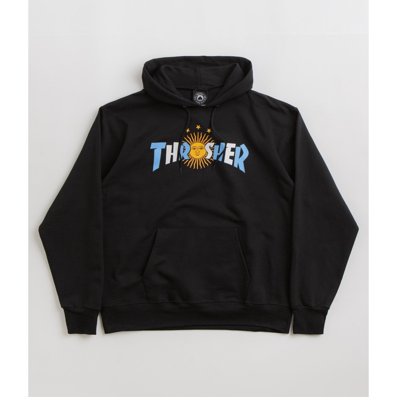 Thrasher Argentina Estrella Hoodie in Black. Tailored to a regular fitting from a cotton-polyester blend, this Thrasher hoodie is styled with a drawstring hood, ribbed cuffs and a woven elastic hem. Finished in a shade of black with a kangaroo front pocket and an Argentinian themed Thrasher chest graphic.