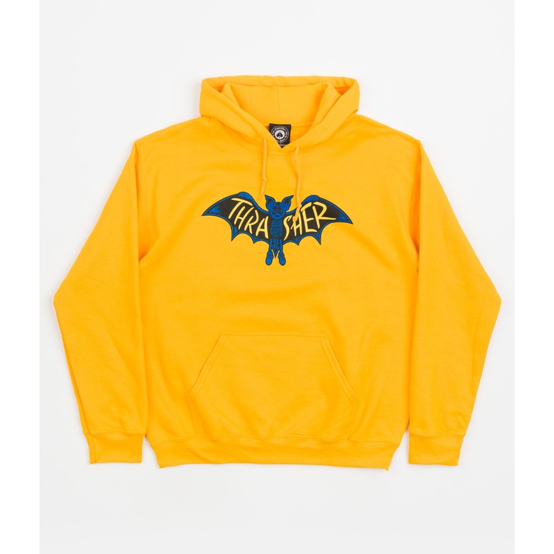 DescriptionThrasher Bat HoodieThrasher Bat Hoodie in Gold. Featuring exclusive artwork from Ed Syder, this Thrasher hoodie is made from a cotton-polyester blend and is tailored to a regular fitting. Featuring a drawstring hood, rib knit cuffs and a classic