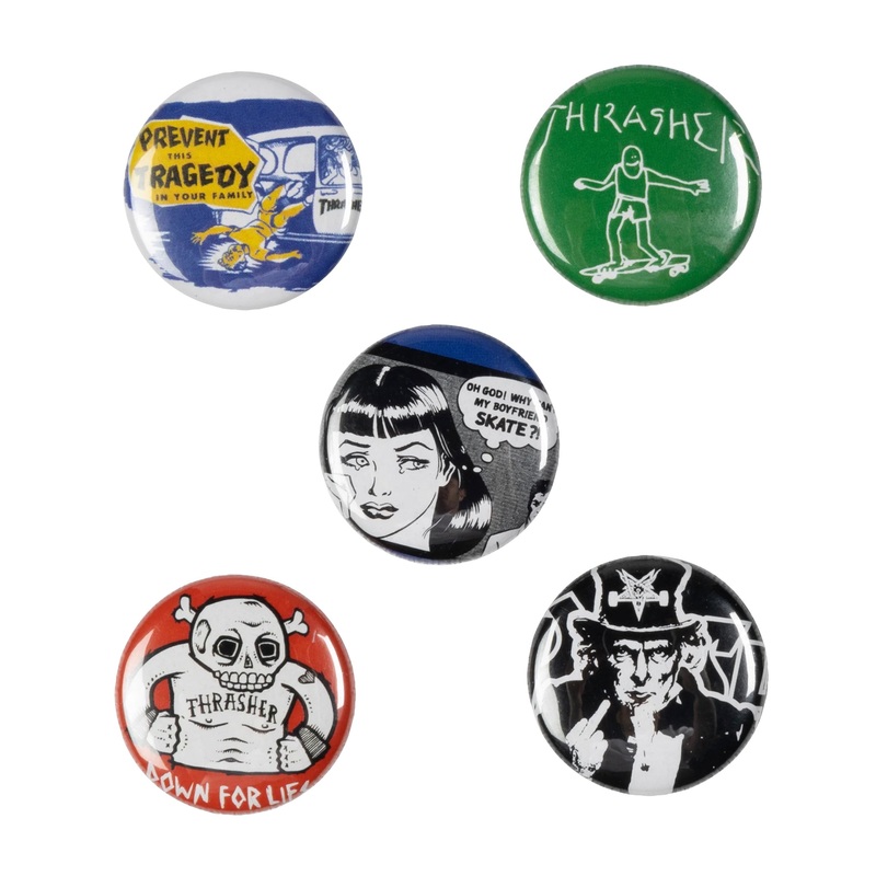 5 Pack of plastic-coated buttons. Includes Gonz logo, Uncle Skategoat graphic, “Why can”t my boyfriend skate?” graphic, Down for Life logo and Tragedy graphic.