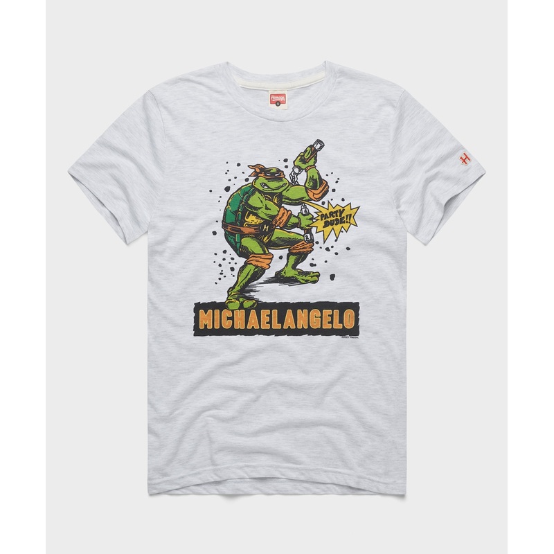 The half-shell hero in the orange mask. Pay homage to the creators original spelling, or should we say misspelling, of the added a in the hero now known as Michelangelo. He is the goofball of the bunch, always lifting the mood and chowing down when given the chance. Not to be messed with, hes an expert with his nun-chucks. Michaelangelo is mighty!
