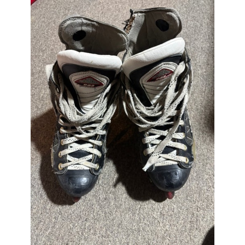 No visible skate size on these heavily used skates. I put them on and they fit and my normal shoe size is 10.5/11. Price reflective of condition. Would be a great skate for street hockey