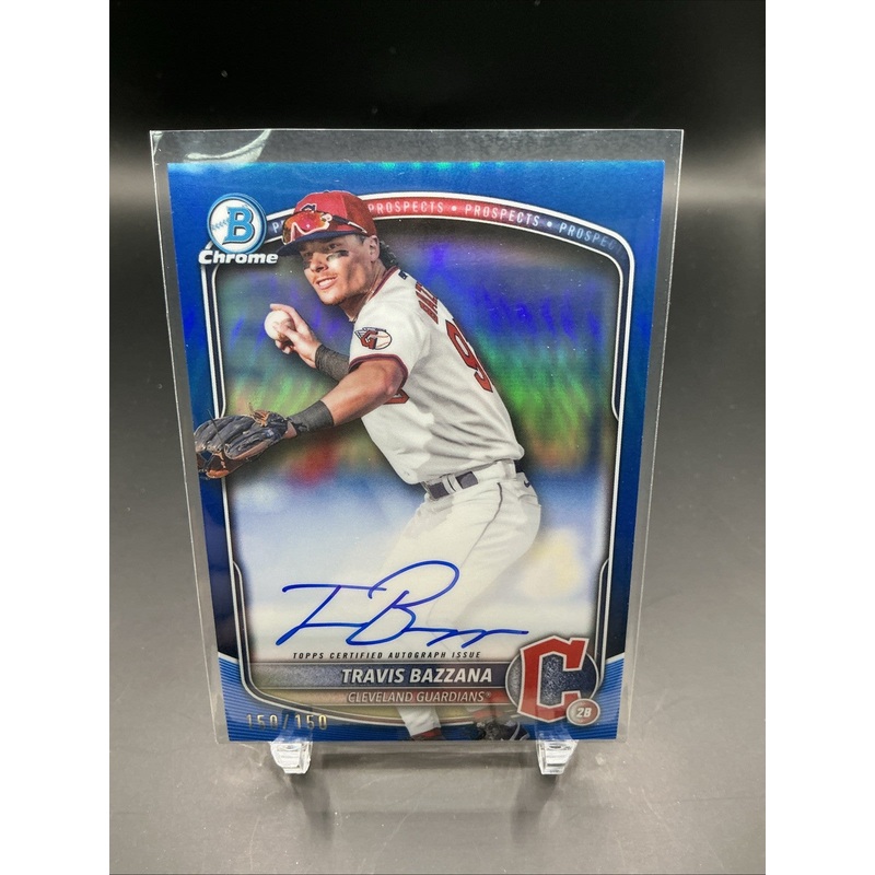 The product is a rare and highly sought-after Travis Bazzana 2025 Bowman Chrome Prospect True Blue Auto trading card. This limited edition card is numbered 150/150 SSP, making it a true rare find for baseball card collectors. Manufactured by Bowman, known for producing high-quality sports trading cards, this card features a unique True Blue parallel variety, adding to its exclusivity. Perfect for fans of baseball and trading card enthusiasts, this card is a standout addition to any collection, showcasing a promising prospect for the 2025 season.