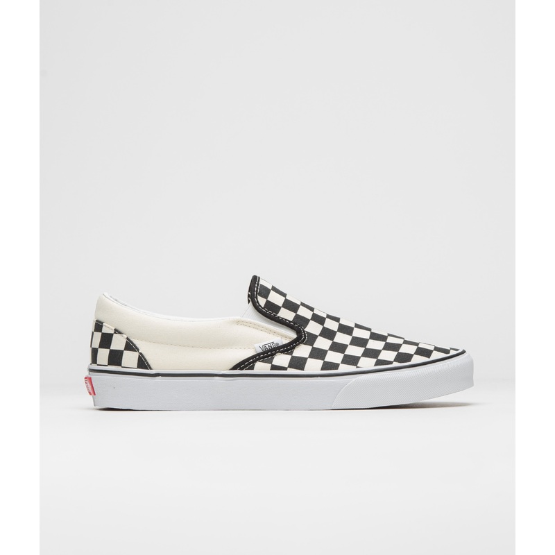 Vans Classic Slip-On Shoes in Black and White Checkerboard. Styled in a classic all-over checkerboard design, this Vans Slip-On features a panelled canvas upper with a padded collar and elasticated tongue wings. Finished in a shade of black and white checkerboard with a wrap-around foxing, printed insoles and with a gum rubber Waffle outsole.