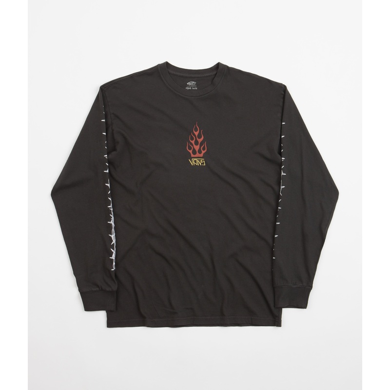 Vans Elijah Berle Vintage Long Sleeve T-Shirt in Black. Part of the brands latest capsule designed in collaboration with skater Elijah Berle, this overdyed Vans t-shirt is tailored to a regular fitting from 100% carded ringspun cotton. Featuring a flexible rib knit collar, cuffed sleeves and a straight cut hem, this black Vans t-shirt is finished with barbed wire sleeve detailing and a flame-like Vans logo printed across the chest.