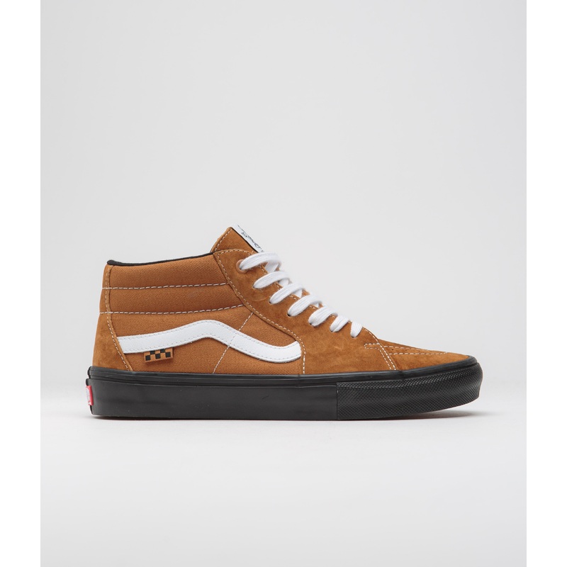 Vans Grosso Mid Shoes in Pig Suede Brown and Black. A tribute to the late Jeff Grosso, this Vans Grosso Mid signature is designed with mixed material suede and canvas uppers with a contrasting black rubber midsole. Featuring resilient DURACAP reinforcements, a mid-cut collar, a WaffleCup outsole and UltraCush 3D insoles, this brown Vans Grosso Mid also features white leather sidewall stripes. Finished with flat laces, contrast stitches, a checkerboard flag label, printed insoles and with commemorative Grosso Forever tongue labels.