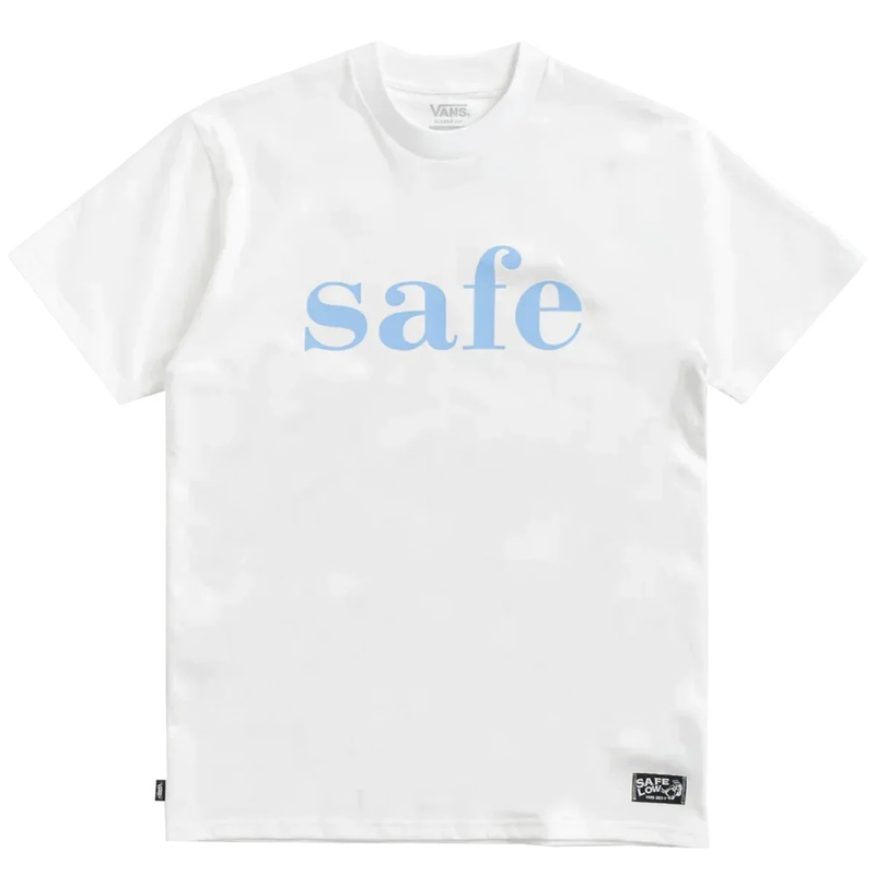 Vans Safe Low T-Shirt in White. Tailored to a regular fitting from 100% cotton, this Vans t-shirt is designed with a classic crew collar and a reinforced hem. Inspired by a vintage design found by skater Rory Milanes, this white Vans Safe Low t-shirt is finished with a centre chest print, a woven side seam flag label and an embroidered above-hem patch graphic.