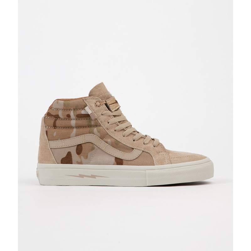 Built with a premium waterproof and flame retardant sand coloured wolverine pig suede and a water resistant treated MultiCam Arid camo textile makes up the Vans Sk8-Hi Notchback Pro upper. Obviously still featuring the Vans side stripe.