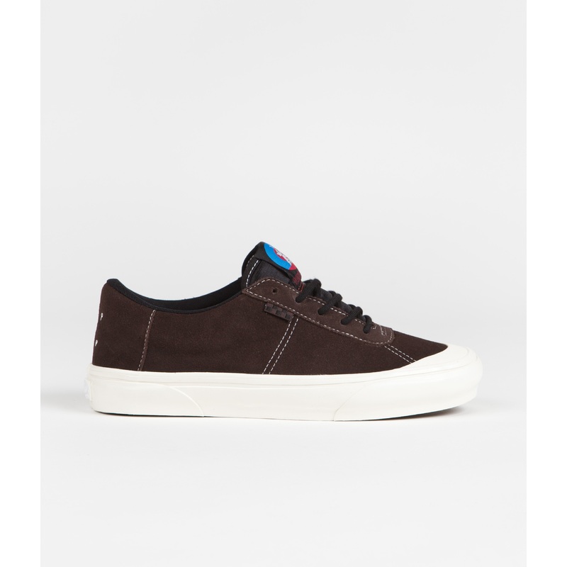 Vans Skate Agah Shoes Pop in Brown and Black. Part of the latest Vans x Pop Trading Company capsule, the Vans Skate Agah arrives as a Skate Classics revision of skater Salman Agahs signature silhouette. Featuring brown suede uppers with contrast white stitching, a new two-part foxing and revised DURACAP underlays, this low collar Vans skate shoe also features a reinforced rubber toe cap and a classic rubber Waffle outsole with a multi-directional underfoot tread. Rounded laces secure the custom Vans Agah embroidered tongue in place, whilst POPCUSH insoles provide additional support and stability. Finished with Vans all-new checkerboard flag labels, embroidered POP heel detailing and with white Off The Wall Skateboarding rubber heel scabs.
