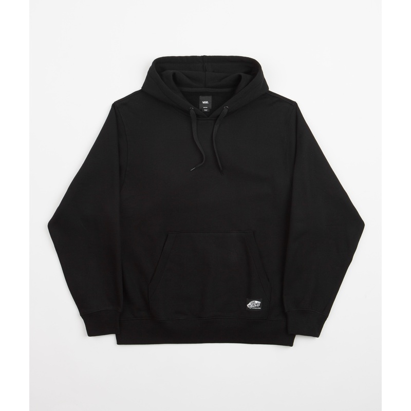 Vans Skate Classics Patch Hoodie in Black. Tailored to a regular fitting from 100% heavyweight cotton, this colour block Vans hoodie arrives as part of the brands Skate Classics collection. Featuring cuffed sleeves, a woven elastic hemline and a two-ply drawstring hood, this black Vans hoodie also features a classic kangaroo front pocket. Finished with a fleece lined interior and with an embroidered Vans Off The Wall Skateboarding flag label sewn across the corner of the front pocket.