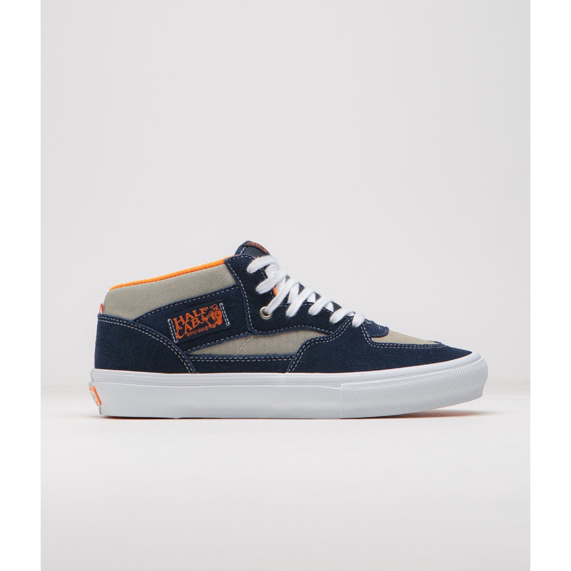 Vans Skate Half Cab Shoes in Smoke and Navy. A Steve Caballero signature, this Vans Skate Half Cab is designed with mixed suede and canvas uppers with a contrasting lining and with contrasting white stitching. Featuring reinforced DURACAP underlays, POPCUSH insoles and with SickStick compound, this navy Vans Skate Half Cab also features a vibrant orange rubber Waffle outsole. Finished with woven Half Cab flag labels, a padded collar, checkerboard flag labels and with Off The Wall Skateboarding heel plates.