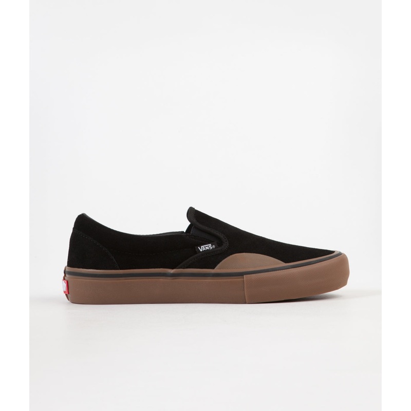 DescriptionVans Slip On Pro ShoesEnhanced with modern developments of Vans quality driven technology, these Slip-On Pros are made from tough black suede with a brown outsole. Duracap reinforcement throughout the rubber underlays provides extra durability i