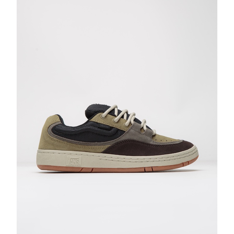 Vans Speed LS Shoes in Outdoors Multi and Black. Designed with a modernised mid-90s cupsole, this archive inspired Vans Speed LS is styled with suede and mesh uppers. Featuring a perforated toe box, double-layered panels and rounded laces, this green brown Vans Speed LS is finished with a gum rubber outsole, rubber tongue logos and with a multi-direction tread pattern.