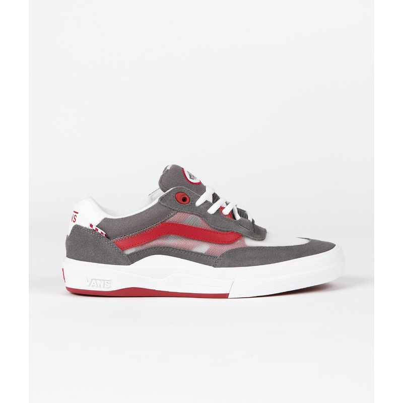 Vans Wayvee Shoes in Grey and Red. A revolutionary silhouette styled with suede, leather and translucent mesh uppers, the Vans Wayvee is a technical skate shoe ultimately designed by skaters for skaters. Featuring a reinforced DURACAP toe cap, an integrated LuxLiner and an energy returning PopCush sockliner, the Vans Wayvee returns in a classic grey, white and red colourway. Puffy laces secure the padded and embroidered tongue in place, whilst each see-through midfoot features a tonal leather stripe and supportive inner-cage detailing. Finished with a woven checkerboard flag label, printed insoles and with Vans Off The Wall Skateboarding rubber heel scabs.