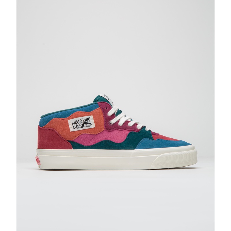 Vans x by Parra Half Cab Shoes in Multi. Part of the brands OTW collection and a tribute to Go Skateboarding Day 2024, this Vans Half Cab is designed in collaboration with by Parra. Featuring multi-coloured panelled suede uppers and a textile lining, this Vans Half Cab also features flat white laces, DURACAP underlays and SickStick rubber compound. Finished in a shade of green, pink, orange and blue with woven Half Cab flag labels, custom printed Vans x by Parra insoles, a gum rubber Waffle outsole and with custom Off The Wall heel plates.