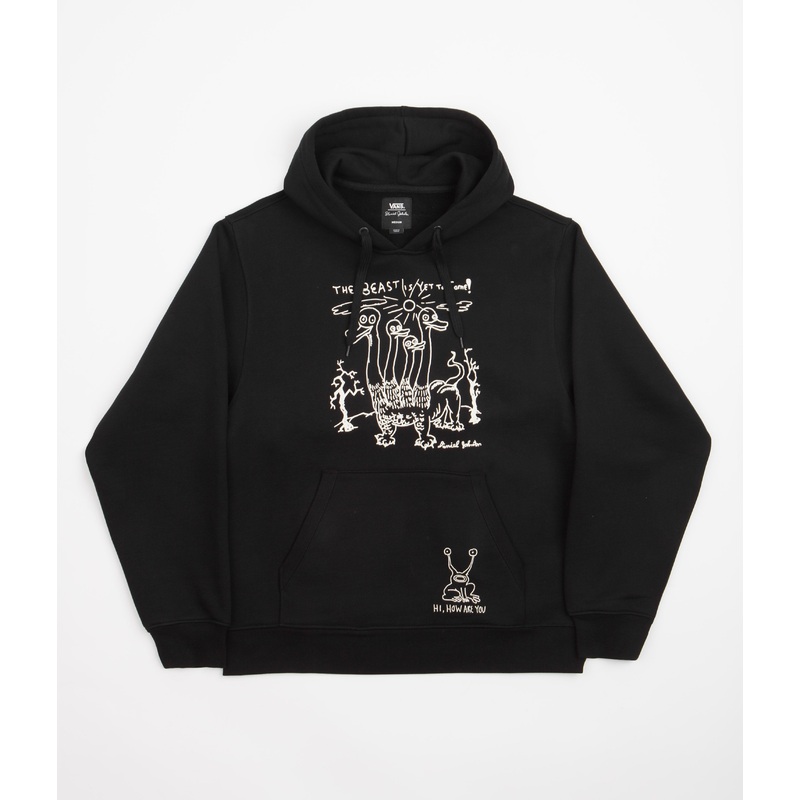 Vans x Daniel Johnston Hoodie in Black. Tailored to a regular fitting from a blend of 70% cotton and 30% polyester, this 435gsm Vans x Daniel Johnston hoodie is a fleece pullover designed in partnership with the Hi, How Are You Project. Featuring cuffed sleeves, a rib knit elastic hemline and a split panel hood with tonal drawstrings. A dual entry kangaroo pocket can be found above the waist, whilst this black Vans hoodie is finished with exclusive screen printed artwork from Daniel Johnston across the front and on the back.