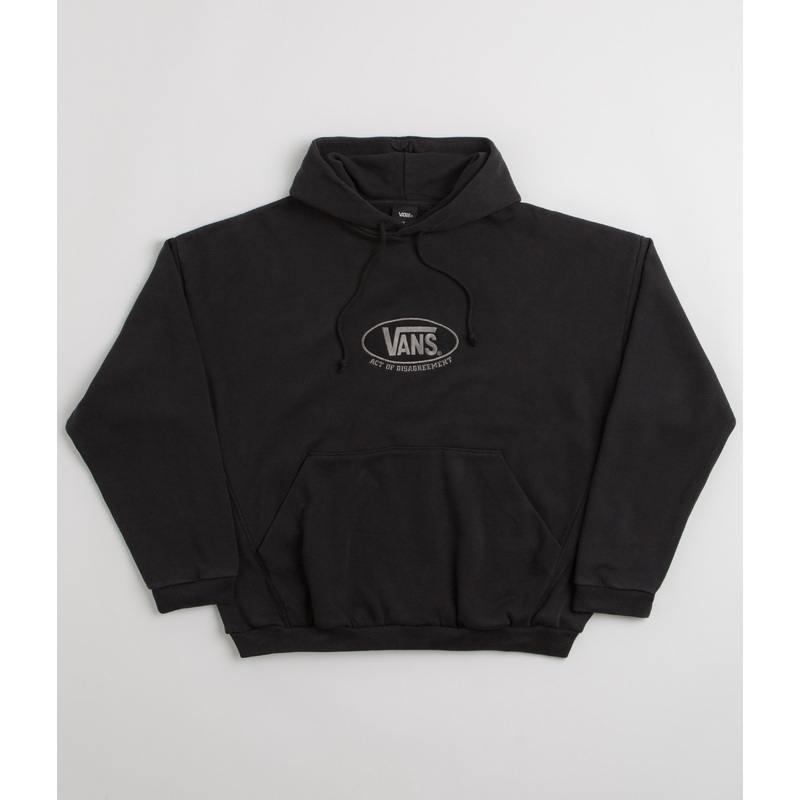 Vans x SlamJam AOD Oval Logo Hoodie in Washed Black. Oversized and made from 100% heavyweight cotton fleece, this Vans hoodie is designed in collaboration with Act of Disagreement. Featuring an adjustable drawstring hood, ribbed side panels and ribbed cuffs, this washed black Vans hoodie is finished with a kangaroo front pocket and an embroidered chest logo.